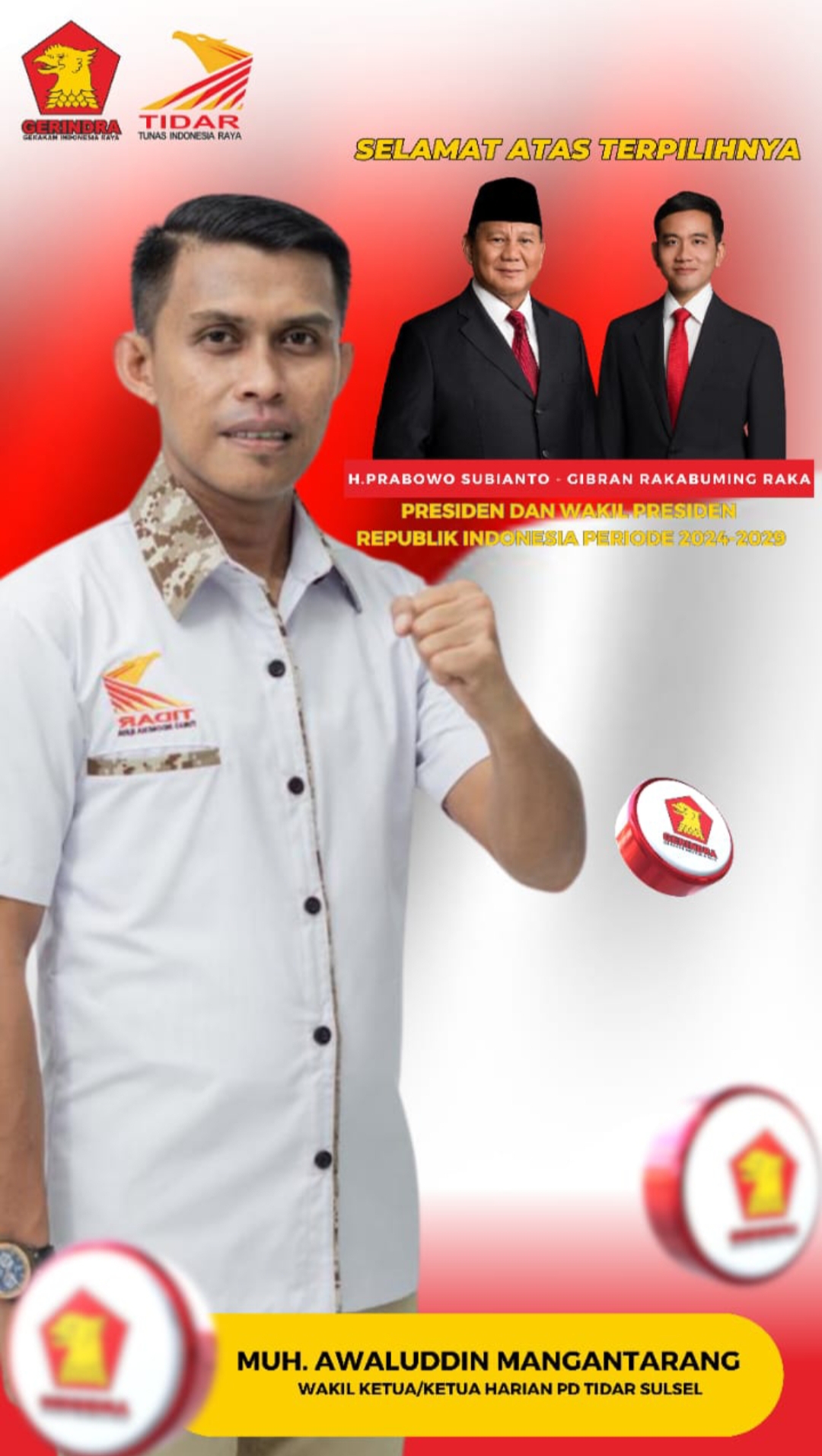 Atas kemenangan pasangan Prabowo – Gibran, disambut gembira oleh tim dan seluruh simpatisan Pasangan nomor utut 2 tersebut, seperti halnya Ketua Harian TIDAR (Tunas Indonesia Raya) Sulsel, sayap underbow Partai Gerindra, Muh. Awaluddin Mangantarang.