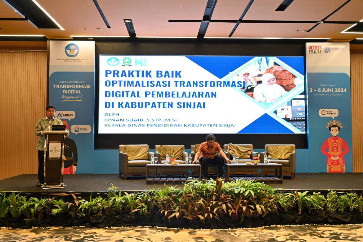 MAKASSAR, BB – Kepala Dinas Pendidikan (Kadisdik) Kabupaten Sinjai, Irwan Suaib, S.STP., M.Si., menjadi narasumber dalam Rapat Koordinasi Transformasi Digital yang diselenggarakan oleh Kementerian Pendidikan, Kebudayaan, Riset, dan Teknologi (Kemendikbud Ristek) di The Rinra Hotel Makassar, Selasa (4/6/24) sore.