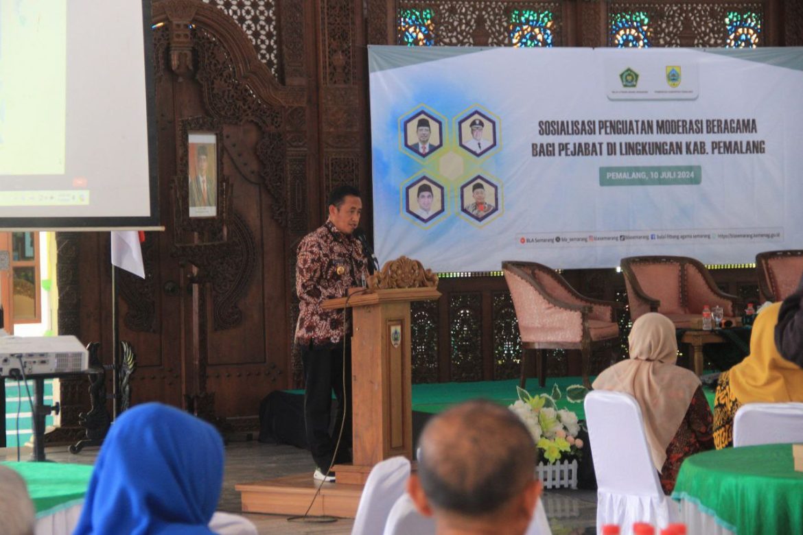 PEMALANG,BB—Bupati Pemalang Mansur Hidayat membuka sosialisasi penguatan moderasi beragama bagi pejabat di lingkungan Pemerintah Daerah Kabupaten Pemalang di Pendopo Kabupaten setempat, Rabu (10/7/2024).