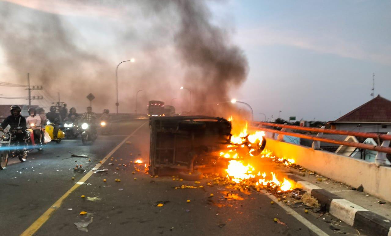 Nahas, pada saat bersamaan ada kendaraan roda tiga bermuatan buah dari arah berlawanan. Karena jarak sudah dekat, tabrakan tidak bisa terhindarkan. Akibatnya kerasnya benturan, kendaraan roda tiga yang dikendarai Jerry Pujianto tersebut terbakar.