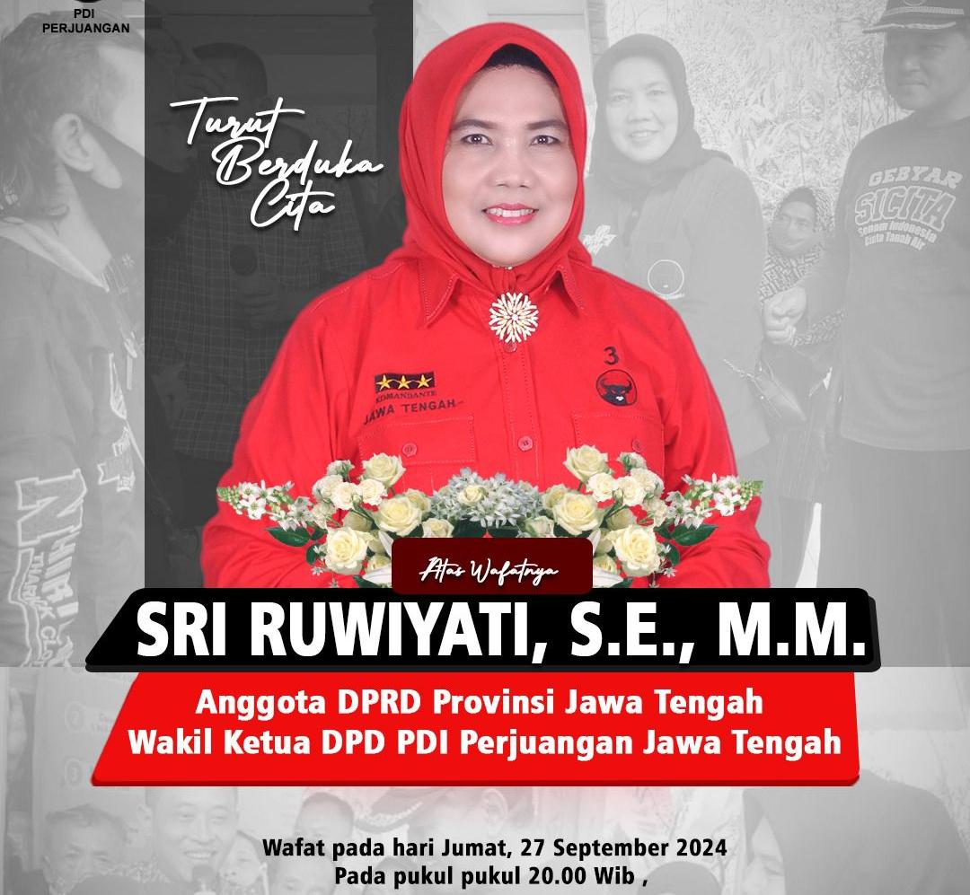 Diketahui, Alm Hj Sri Ruwiyati saat ini menjabat sebagai Wakil Ketua DPD PDI Perjuangan dan anggota DPR Provinsi Jawa Tengah. Beliau adalah ibunda dari dr Bugar Wijiseno MARS FISQua, calon Bupati Banjarnegara 2024 – 2029.