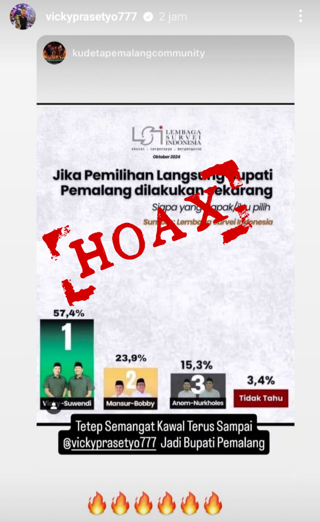 PEMALANG,BB—Beredar hasil survei hoax menampilkan presentase elektabilitas pasangan calon bupati dan wakil bupati pada Pilkada Pemalang 2024.