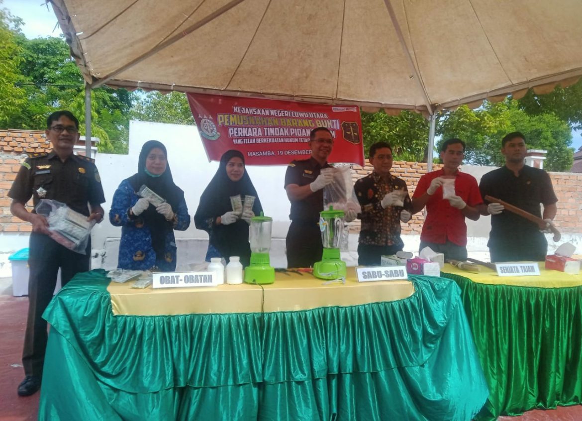 BERITABERSATU.COM, LUWU UTARA — Kejaksaan Negeri Luwu Utara melaksanakan pemusnahan ratusan gram sabu beserta barang bukti lainnya di halaman Kantor Kejaksaan Negeri, Kamis (19/12/2024).