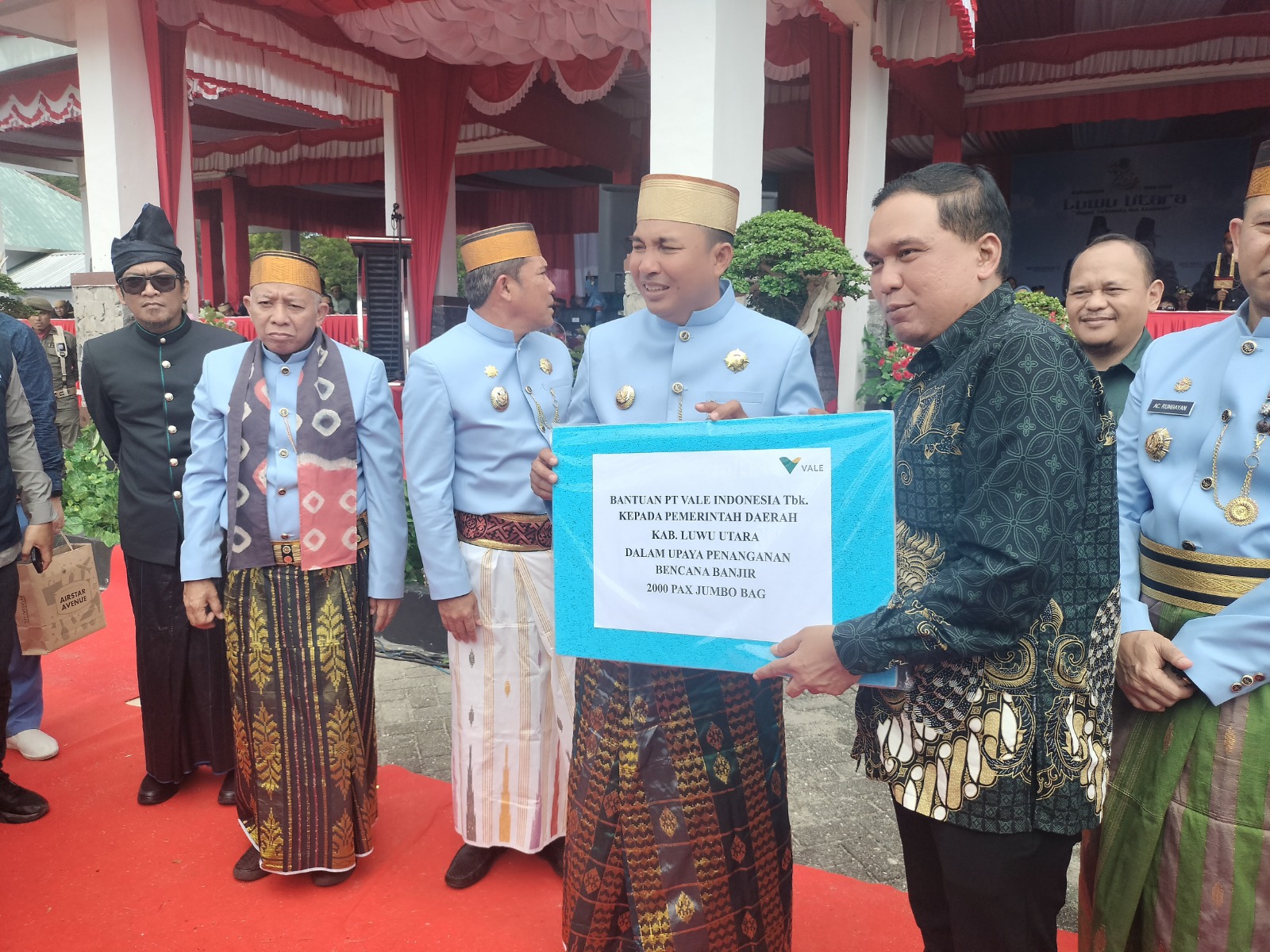 Penyerahan bantuan dilakukan secara simbolis oleh Director External Relation PT Vale, Endra Kusuma, kepada Bupati Andi Rahim pada puncak perayaan Hari Jadi XXVI Luwu Utara, Selasa (20/5/2025), di Lapangan Taman Siswa, Masamba.