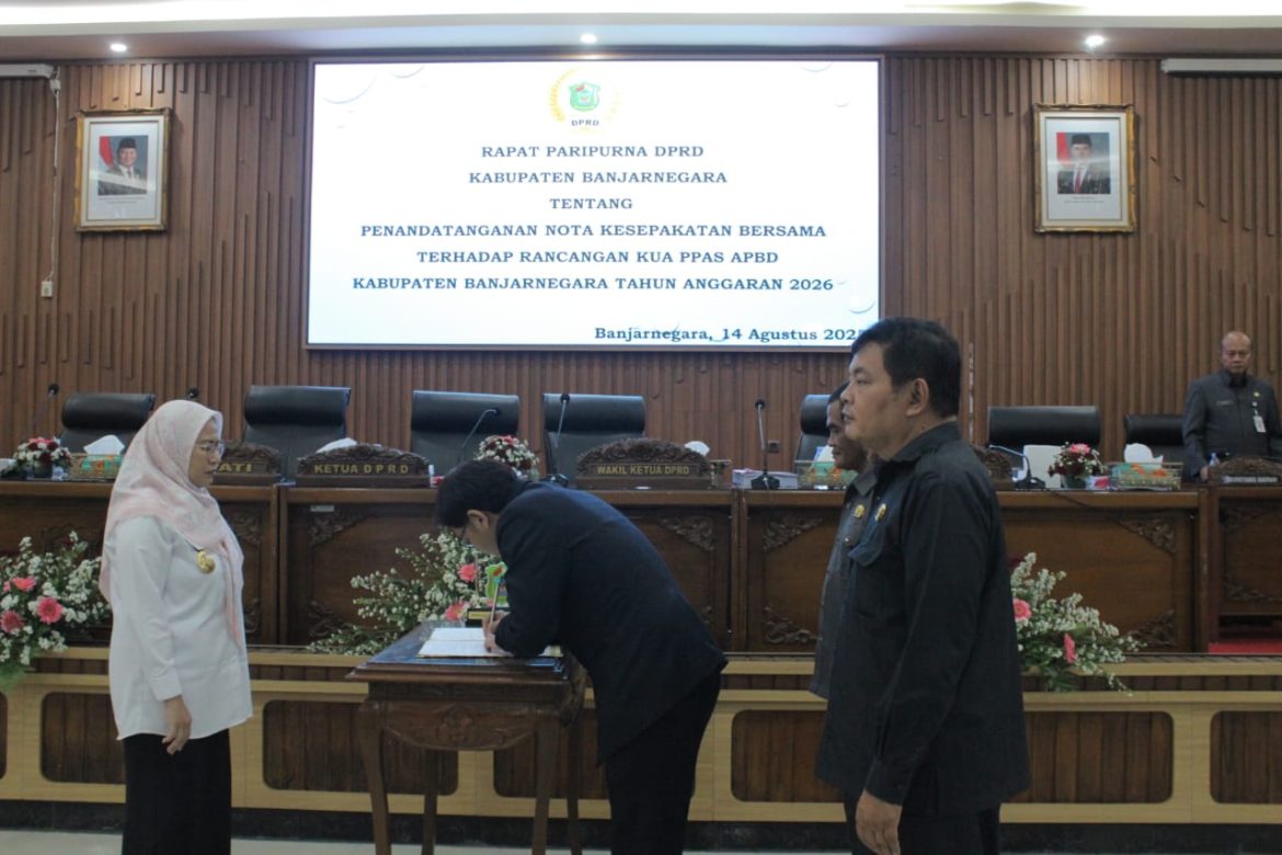 Banjarnegara, Beritabersatu – DPRD Kabupaten Banjarnegara, menggelar rapat paripurna dengan agenda penandatanganan nota kesepakatan Rancangan Kebijakan Umum Anggaran dan Prioritas Plafon Anggaran Sementara (KUA-PPAS) APBD Banjarnegara Tahun Anggaran (TA) 2026, di ruang paripurna, Kamis (14/8/2025).