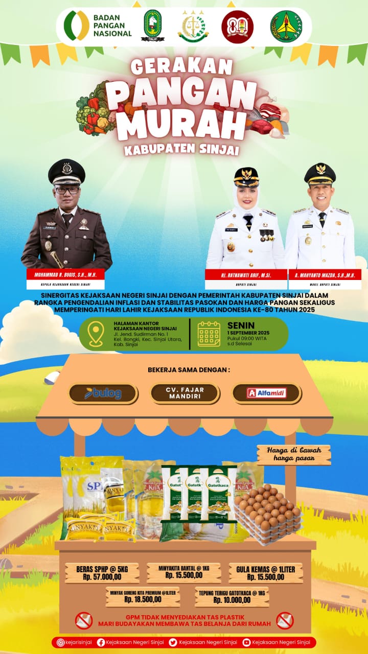 BERITABERSATU.COM, SINJAI – Kejaksaan Negeri (Kejari) Sinjai bersama Pemerintah Kabupaten Sinjai akan menggelar Gerakan Pangan Murah (GPM) pada Senin, 1 September 2025.