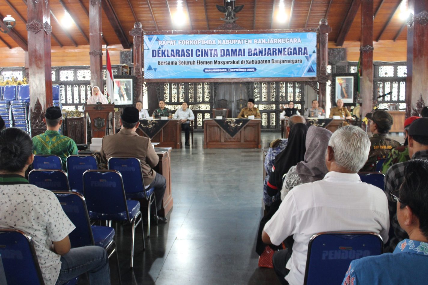 Pemerintah Kabupaten (Pemkab) Banjarnegara bersama Forum Koordinasi Pimpinan Daerah (Forkopimda), tokoh lintas agama, tokoh masyarakat, Ojol, LSM, Ormas, KNPI Banjarnegara, serta seluruh elemen masyarakat, melakukan Deklarasi Cinta Damai di Pendapa Dipayudha Adigraha Banjarnegra, Senin (1/9/2025).