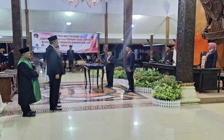 Beritabersatu.com, Blitar – Bupati Blitar, Drs. H. Rijanto, MM, melantik dan mengambil sumpah/janji Jabatan Pimpinan Tinggi (JPT) Pratama di lingkungan Pemerintah Kabupaten Blitar. Acara digelar khidmat di Pendopo Ronggo Hadinegoro, Kamis 13 November 2025 malam, dan dihadiri jajaran Forkopimda, Ketua DPRD, Sekda, para kepala perangkat daerah, camat, serta pejabat yang dilantik.