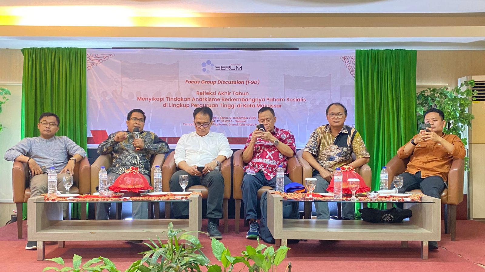 BERITABERSATU.COM, MAKASSAR – Serum Institute menggelar Forum Group Discussion (FGD) bertajuk Refleksi Akhir Tahun, Menyikapi Tindakan Anarkisme dan Perkembangan Paham Sosialis di Lingkup Perguruan Tinggi Kota Makassar, Senin 1 Desember 2025. Kegiatan ini berlangsung di Hotel Grand Asia Makassar dan menghadirkan ratusan peserta yang mayoritas merupakan mahasiswa dari berbagai perguruan tinggi di kota tersebut.