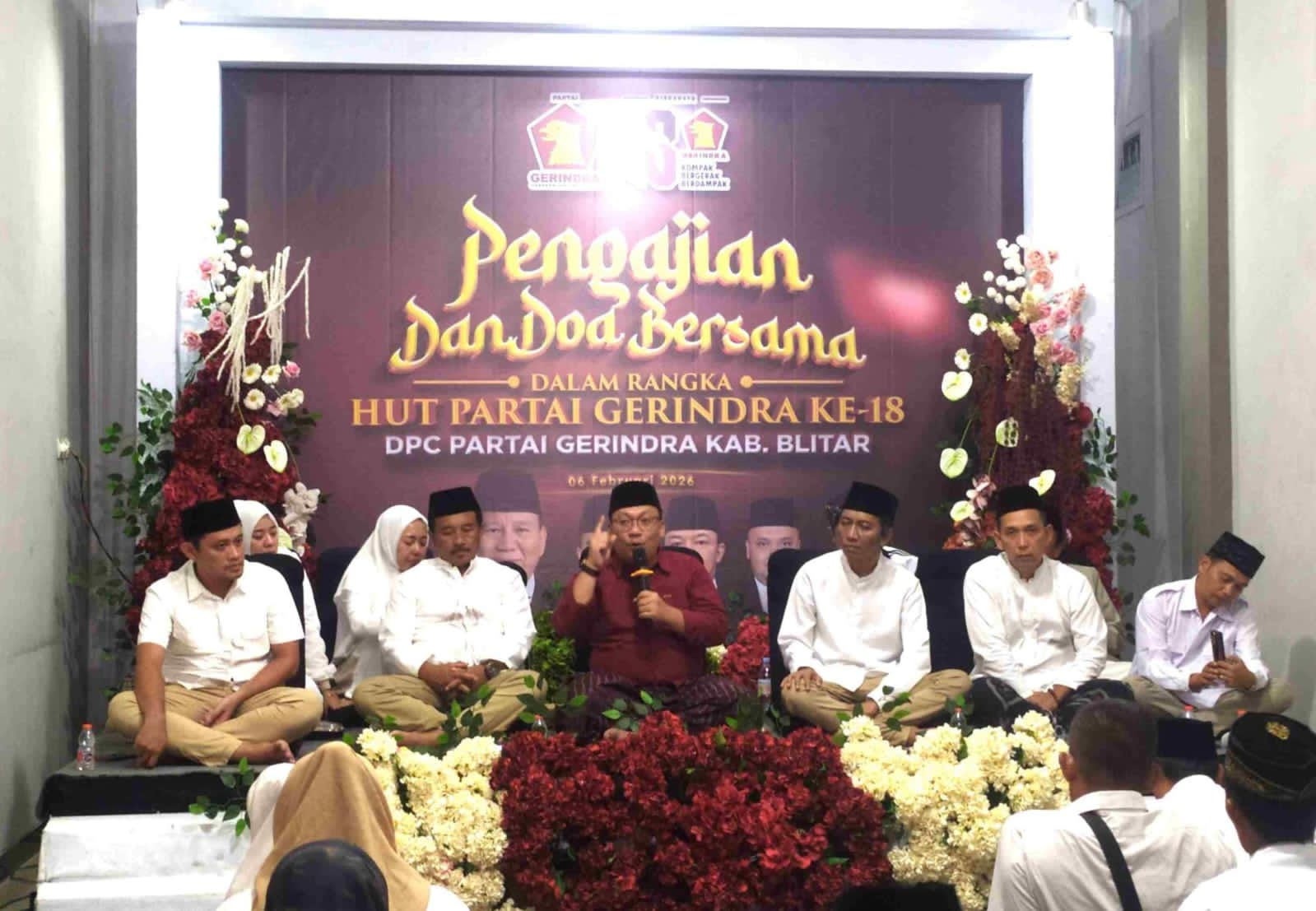 Beritabersatu.com, Blitar – Dewan Pimpinan Cabang (DPC) Partai Gerindra Kabupaten Blitar menggelar syukuran Hari Ulang Tahun (HUT) ke-18 Partai Gerindra secara sederhana pada Jumat (6/2/2026). Kegiatan yang berlangsung di Kantor DPC Gerindra Kabupaten Blitar tersebut dikemas dengan pengajian dan potong tumpeng.