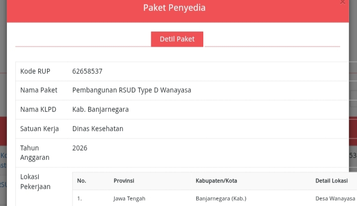 Proyek tersebut tercantum dalam Sistem Rencana Umum Pengadaan (RUP) dengan kode 62658537 di bawah Satuan Kerja Dinas Kesehatan (Dinkes) Kabupaten Banjarnegara yang bersumber dari APBD 2026.